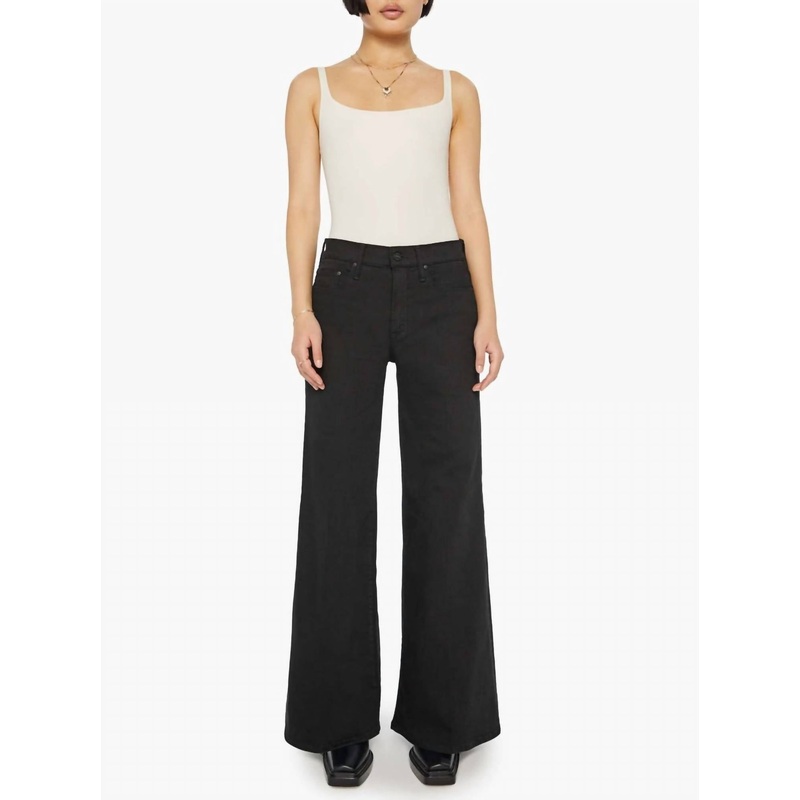 The Lil’ Twister Sneak by Mother features a high-rise flared, wide-leg design, perfect for women 5’4″ and under. Crafted from a cotton blend with 68% cotton, 18.5% recycled polyester, 12% reused cotton, and 1.5% elastane, these jeans offer a touch of stretch for a comfortable fit. They boast a solid black color called Pitch with tonal hardware, a 31-inch inseam, and a 26 1/2″ leg opening. Originating from Los Angeles, these jeans include a zip closure and are easy-care with a machine wash recommendation.