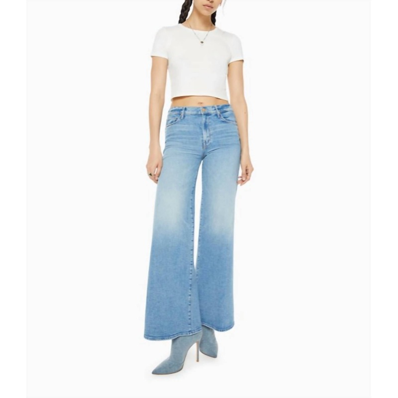Elevate your denim collection with The Twister Skimp by Mother, expertly crafted from a blend of 79% Cotton, 20% Post-Consumer Recycled Cotton, and 1% Elastane. These high-rise jeans showcase a relaxed, wide-leg fit with a 33-inch inseam and a 10-inch rise, complemented by a flared design and a clean hem. Meticulously made in Los Angeles, they feature a button closure and handy pockets. Embrace the Horseback To Quarterback light blue wash with subtle whiskering and knee fading, and enjoy hassle-free maintenance with machine wash care.