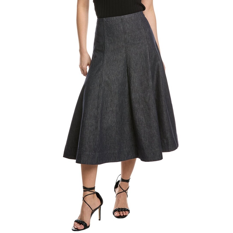 Elevate your casual wardrobe with the Theory Flare Seam Midi Skirt in indigo. This stylish piece is approximately 31 inches from waist to hem and features a left side seam zipper with hook-and-eye closure. Made from 100% cotton, this skirt is easy to care
