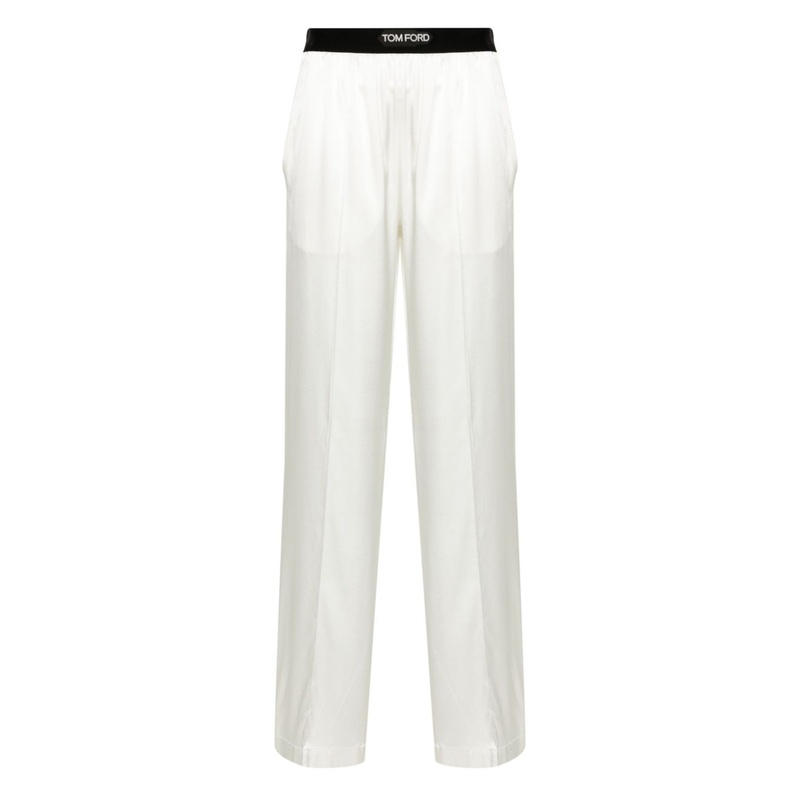 white/black silk blend satin finish velvet trim ruched detailing raised seam detail logo patch to the front high-waisted elasticated waistband two side slit pockets two rear patch pockets straight leg This piece fits true to size. We recommend you get your