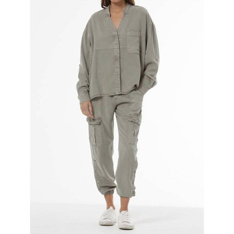 A soft denim jogger featuring a drawcord and elasticized waist, elasticized cuffs, front pockets, back slit pockets, and additional side flap cargo pockets with seam panel detailing. Fabric – 100% Tencel. Care – Gentle machine wash.