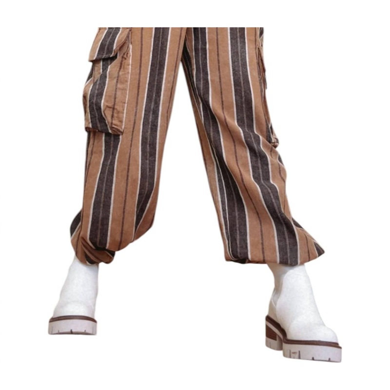 Striped Jogger. POL. Elastic Cuff. Cargo style pockets. Functional pockets. Drawstring waistband. 100% Cotton.