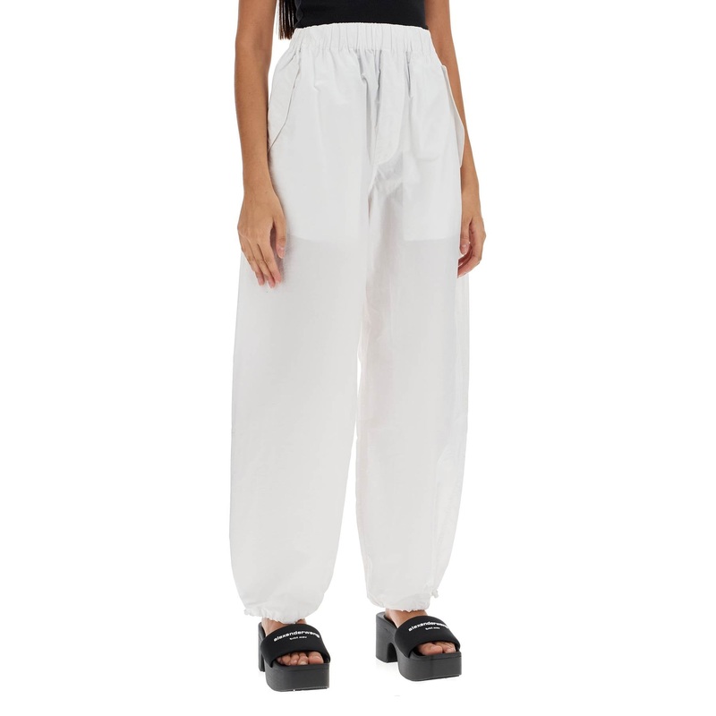 Wardrobe.NYC's Parachute Pants are made from lightweight technical cotton poplin with a wide leg that can be adjusted at the bottom with a drawstring. They feature an elasticated waistband with an internal drawstring, French pockets with flaps, and a patch