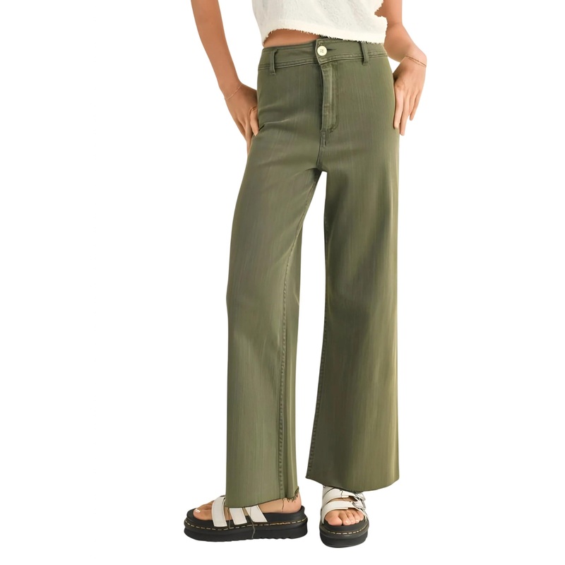 Upgrade your casual wardrobe with the Wide Leg Cut-Off Denim by MIOU MUSE, a perfect blend of comfort and style. These olive pants feature a high-rise waist and relaxed fit, crafted from 98% cotton and 2% spandex for stretch and durability. Complete with a button closure, zipper detail, and back pockets, these wide-leg pants boast a chic cut-off hem. For maintenance, simply hand wash cold and line dry. Ideal for effortless day-to-night transitions, they harmonize with both casual tees and dressier tops. Model is wearing a size small [5’7.5″ height, 24″ waist, 34″ hips].