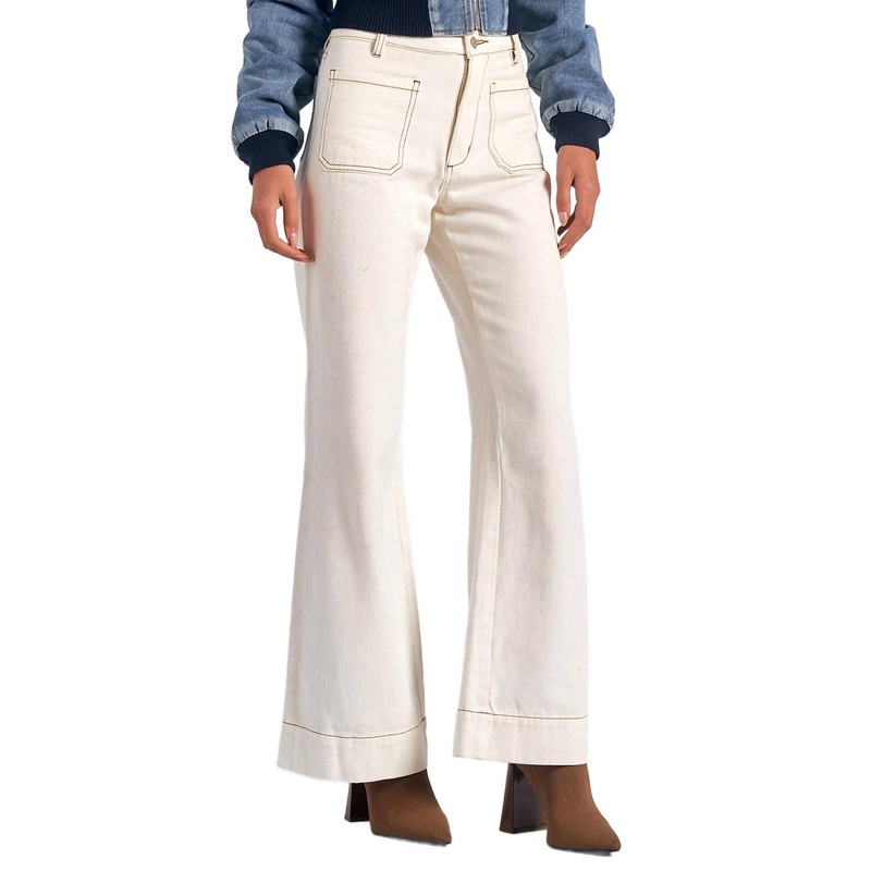 Elevate your wardrobe with the ELAN Wide Leg Jeans, meticulously crafted from a comfortable cotton blend in a classic white hue. These wide-leg jeans feature a stylish contrast stitching and are designed with front and back pockets for practicality. The so