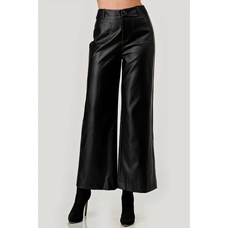 faux leather, solid, pants, high-waist, wide-leg, belt loops, front zipper and button, front and back patch pockets,
