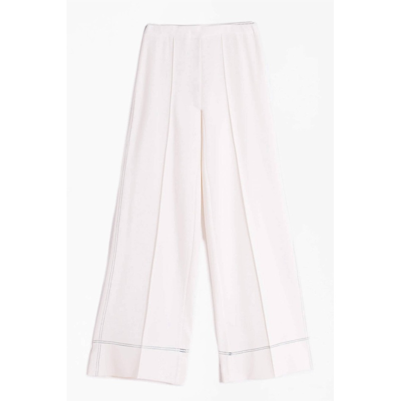 Discover the Women's Beatriz Trouser by Vilagallo, a chic addition in an off-white shade. These ankle-length trousers boast a wide-leg design with a relaxed fit, featuring a deep cuff with eye-catching black contrast stitching. Crafted from 95% polyester a