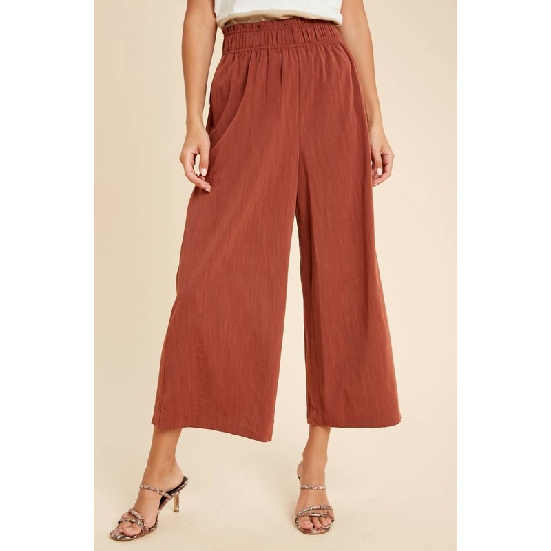 Women’s Double Gauze Cropped Pants. MIOU MUSE. Breathable double gauze material. Chic wide-leg cut. Chestnut hue. Pull-on closure. Smocking waist. Ease. All-day comfort. Solid-pattern. Side pockets. Versatile comfort fit.