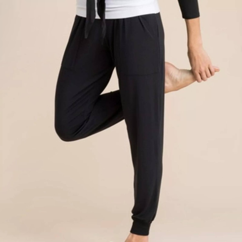 Pair these with your favorite sneakers for an effortlessly cool look.Introducing the Women’s Modern Boho Pants by Peach, a chic addition to your wardrobe in classic black. These track pants are crafted from a soft and stretchy 92% MicroModal and 8% Spandex blend, featuring a high-rise pull-on style with a relaxed fit and tapered leg silhouette. Made in the USA, these pants include practical front pockets and rib-knit ankle cuffs, with a comfortable wide, rib-knit waistband that sits just below the navel. Care is easy with machine wash on a gentle cycle in cold water, and then simply lay flat to dry or tumble dry on low.
