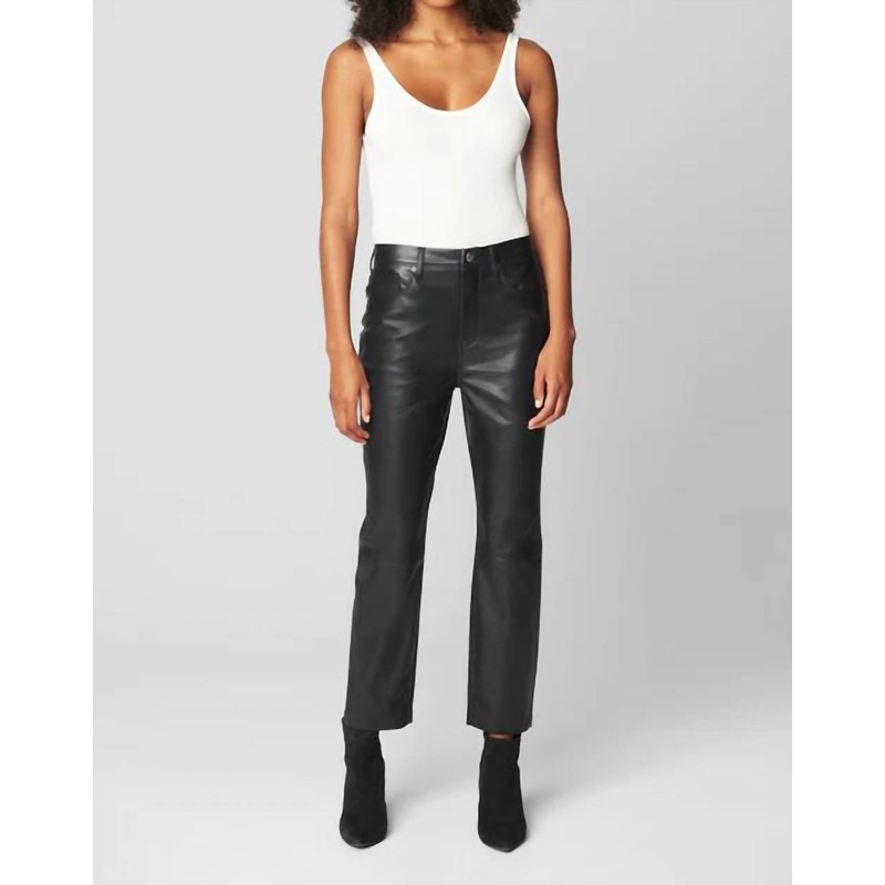 Slightly flared pants are all the rage right now and these are no exception. Pair these with your favorite tee for a more casual look, or with your favorite button-up blouse for an evening out.Cropped Vegan Leather High Rise 5 Pocket Pant60% Polyurethane, 40% ViscoseModel Height – 5’8 – Waist – 24″ – Wearing Size 27