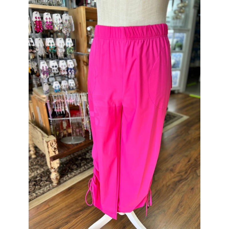 Striking Hot Pink ankle and cropped pants. Showcase a side drawn ankle design with a high-rise elastic waist for added comfort and style. Made from a blend of 76% nylon and 24% spandex. Offer a slight stretch, perfect for a flattering fit. Featuring convenient hip pockets.