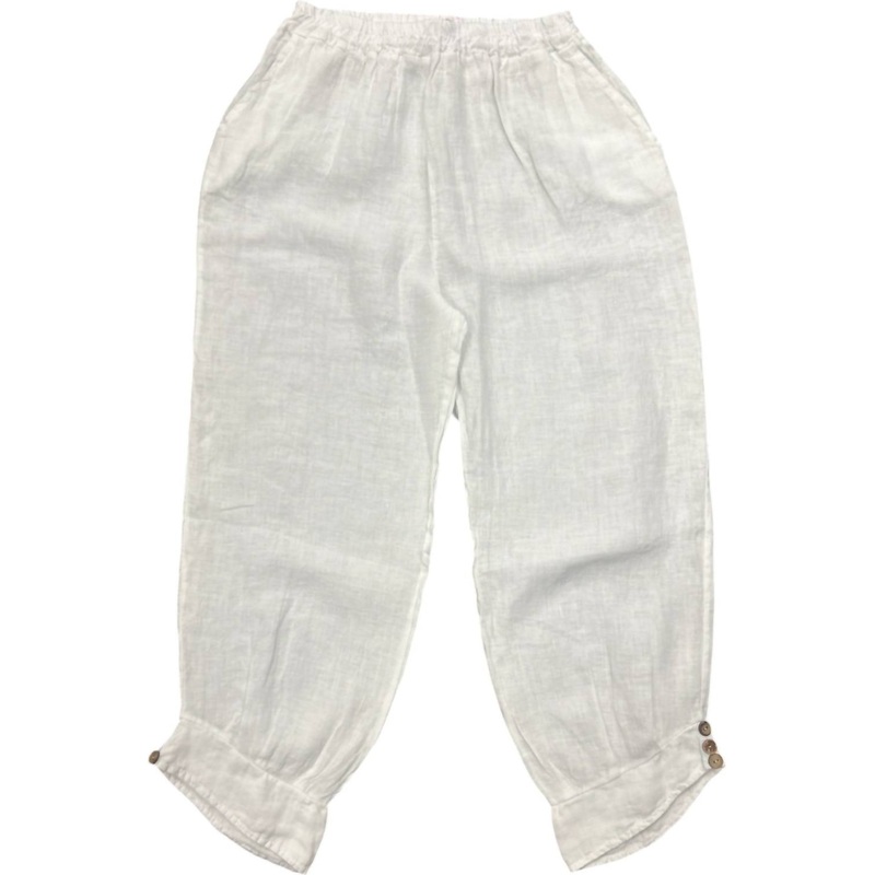 Comfortable and Stylish Design. Ankle Button Detail for a Unique Flair. Crafted from a Lightweight Cotton and Linen Blend.