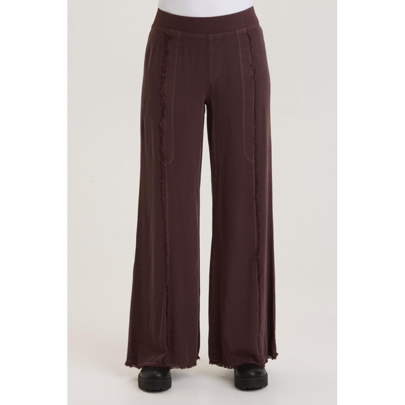 Elevate your wardrobe with the Women's Twill Beach Trouser by Wearables, featuring an ultra-soft Taissa twill in a warm Sarsaparilla hue. The design includes a comfortable pull-on elastic waistband with a faux fly and raw edge style lines. Made from a blen